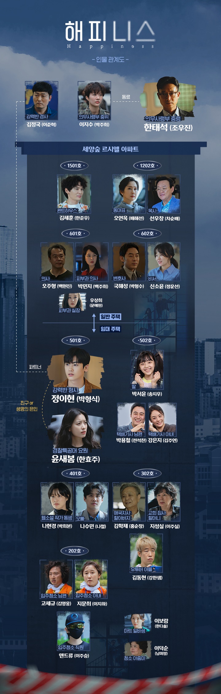 윤새봄은 정이현과 친구관계입니다. 502호에는 박용철, 강은지 부부와 딸 박서윤이 살고 있으며 401호에는 남매인 나현경과 나수민이 거주합니다. 302호에는 김학제 지성실 부부와 유튜버 아들 김동현이 거주하며 202호에는 입주청소를 하는 부부 고세규와 지문희 그리고 직원 앤드류가 거주합니다. 더 자세한 해피니스 인물관계도는 아래의 이미지를 참고하시기 바랍니다.